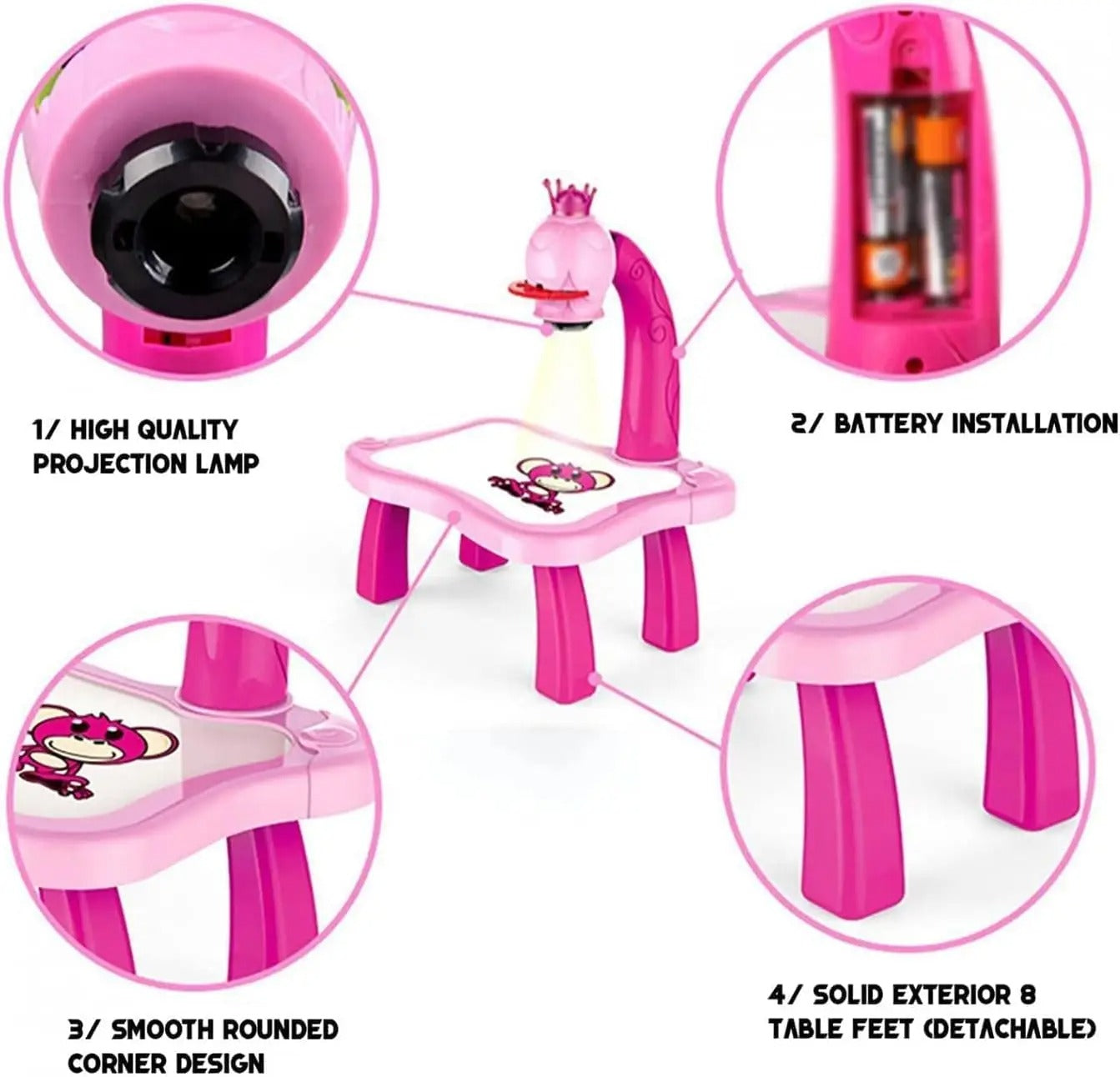 Projektor stočić za crtanje je edukativna igračka koja pomaže deci da kroz igru razvijaju kreativnost, motoriku i interesovanje za crtanje. Zahvaljujući ugrađenom projektoru, slike se projektuju direktno na površinu stočića, pa dete može lako da ih prati i precrtava. Ovakav način igre čini crtanje zabavnim i jednostavnim, čak i za decu koja tek počinju da uče da crtaju.